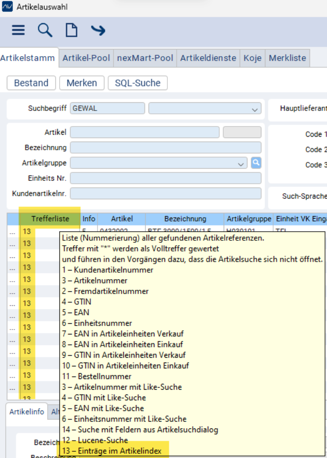 Ab der enventa Trade ERP Version 4.5 gibt es in der Artikelauswahl eine neue Spalte «Trefferliste». Darin ist ersichtlich, aus welcher Suche der Treffer ermittelt wurde. Z. B. per Fremdartikelnummer, Artikelnummer, Artikelindex etc.