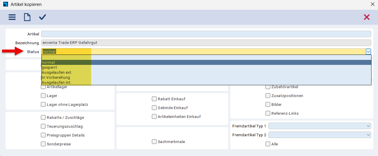 Neu können wir bei der Artikelkopie auch direkt den Status mitgeben, z. B. Status gesperrt.