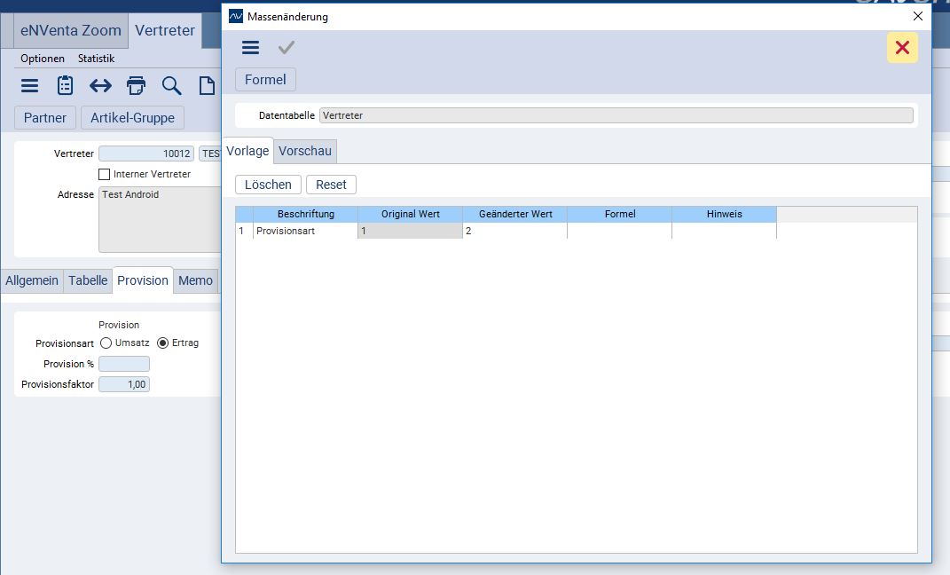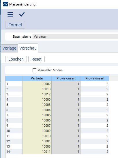 - Suchen Sie alle Daten zusammen, die Sie ändern möchten (Hier hilft die Suche mit SQL). Im vorliegenden Beispiel soll für alle Vertreter die Provisionsart Umsatz auf Ertrag geändert werden.