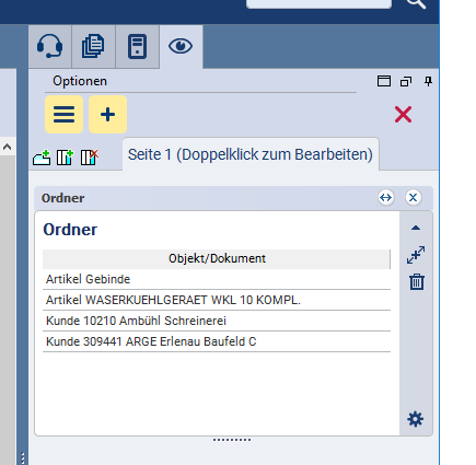 Das Element Ordner erlaubt es Ihnen Stammdaten zu parkieren. Dies funktioniert auch per Drag&Drop. So haben Sie immer wieder benötigte Elemente schnell im Zugriff. Die hier parkierten Datensätze lassen sich per Drag&Drop in den Auftrag einfügen.