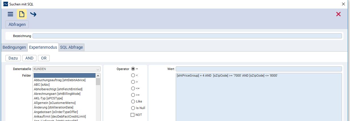 Es öffnet sich der Dialog Suche mit SQL. Im Register Expertenmodus können Sie sich mit den Buttons AND und OR, sowie den zur Verfügung stehenden Operatoren und Variablen, die einzelnen Abfragen zusammenstellen.