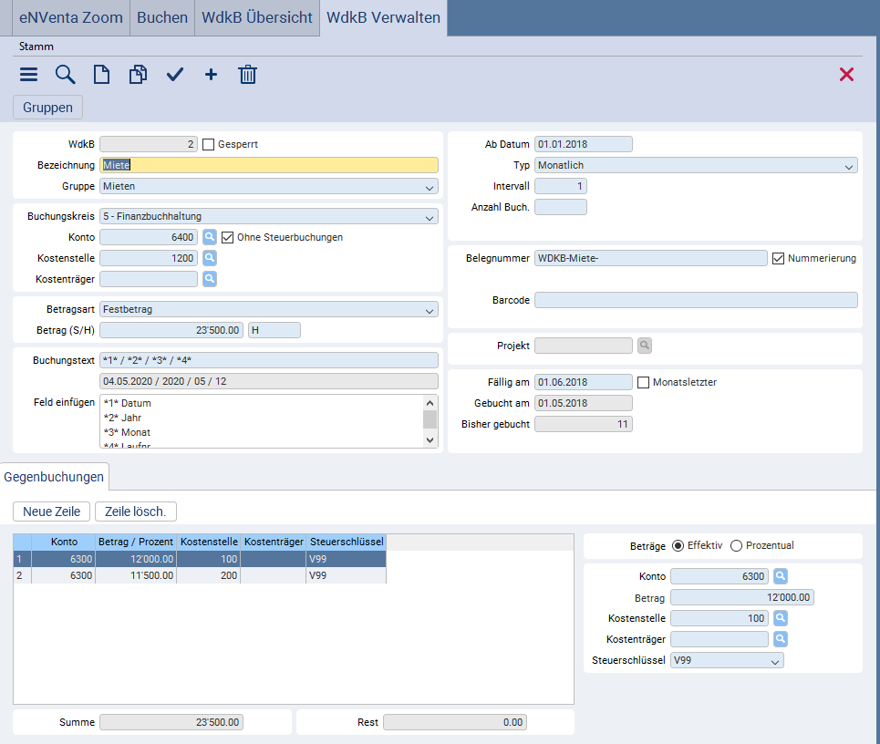 In der Finanzbuchhaltung fallen viele Buchungen in regelmässigen Abständen an. Diese Buchungen können Sie in enventa ERP als wiederkehrende Buchungen erfassen und so einen Teil des Prozesses automatisieren. Eine Änderung einer wiederkehrenden Buchung ist jederzeit möglich – selbst noch direkt am Fälligkeitstag. Wiederkehrende Buchungen legen Sie in der WdkB Übersicht an. Dieser Dialog öffnet sich im Dialog Buchen >> Stamm >> WdkB Übersicht. Die Verwaltung der wiederkehrenden Buchungen (Änderung, Sperrung, Löschung) erfolgt auch in diesem Dialog.