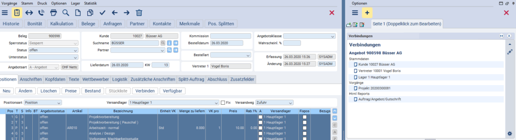 Mit dem Plus-Zeichen fügen Sie Fokus-Elemente hinzu. Im Folgenden werden die beiden Elemente Verbindungen und Ordner präsentiert. Im Fokus-Element Verbindungen werden Ihnen sämtliche Verbindungen zu den Stammdaten, Dokumenten und Vorgängen eines Datensatzes angezeigt. Im Täglichen Arbeitsalltag sparen Sie sich so viel Zeit. Beim Wechsel auf andere Vorgänge wird der Inhalt des Fokus-Elements Verbindungen automatisch aktualisiert.