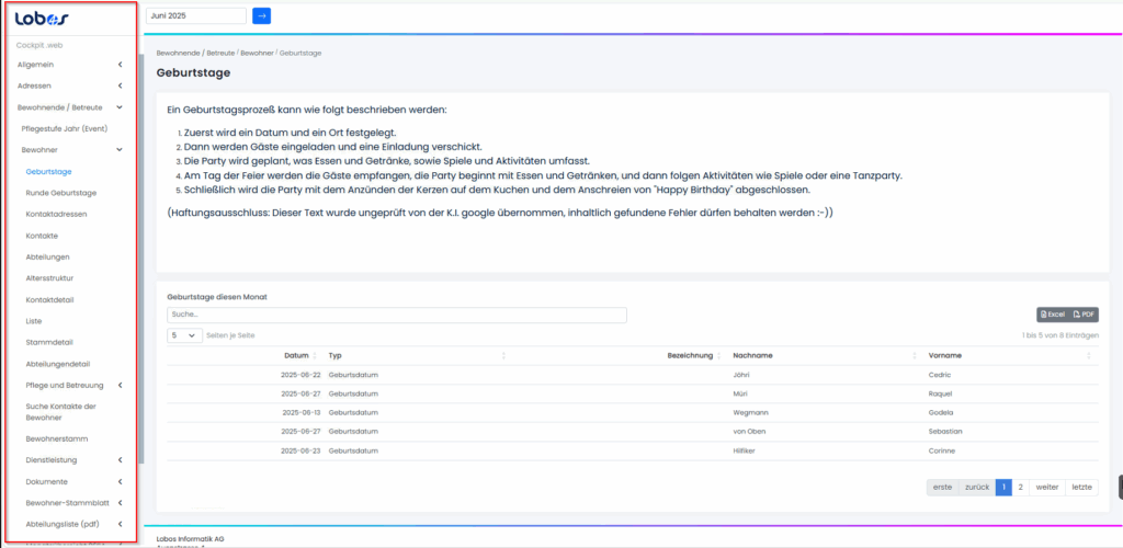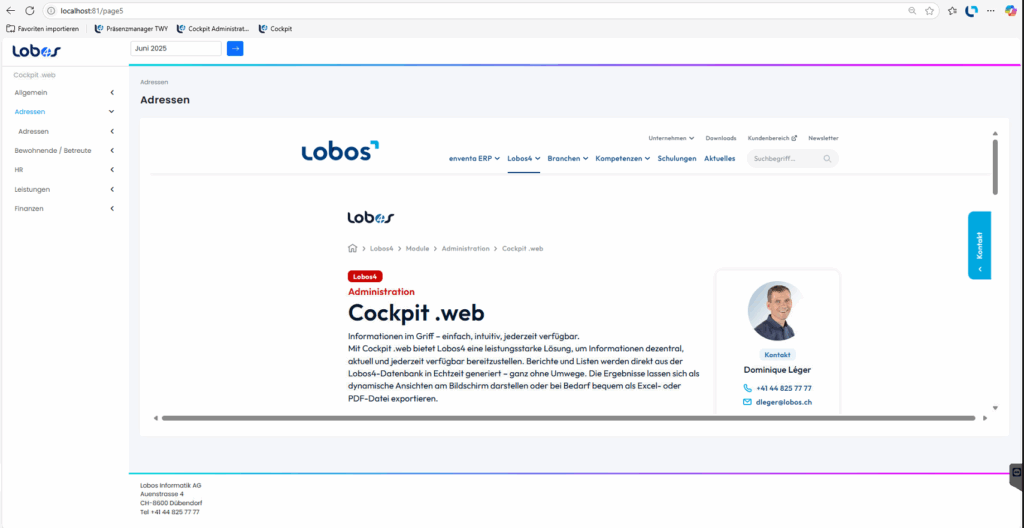Mit dem Cockpit .web von Lobos4 haben Mitarbeitende alle relevanten Informationen – etwa Telefonverzeichnisse oder Geburtstagslisten – auf Knopfdruck zur Hand. Die Benutzeroberfläche ist so intuitiv wie eine klassische Website und lässt sich dank klar strukturierter Hierarchie spielend leicht bedienen – ganz ohne Schulung. Ein integrierter Editor ermöglicht es, individuelle Strukturen aufzubauen, Inhalte wie Texte, Bilder oder Logos einzufügen und gezielt Datenbank-Abfragen zu integrieren – ganz nach Bedarf. Ob im Intranet oder öffentlich im Internet: Das Cockpit .web ist vielseitig einsetzbar. Die Lizenz deckt unbegrenzt viele Nutzerinnen und Nutzer ab.